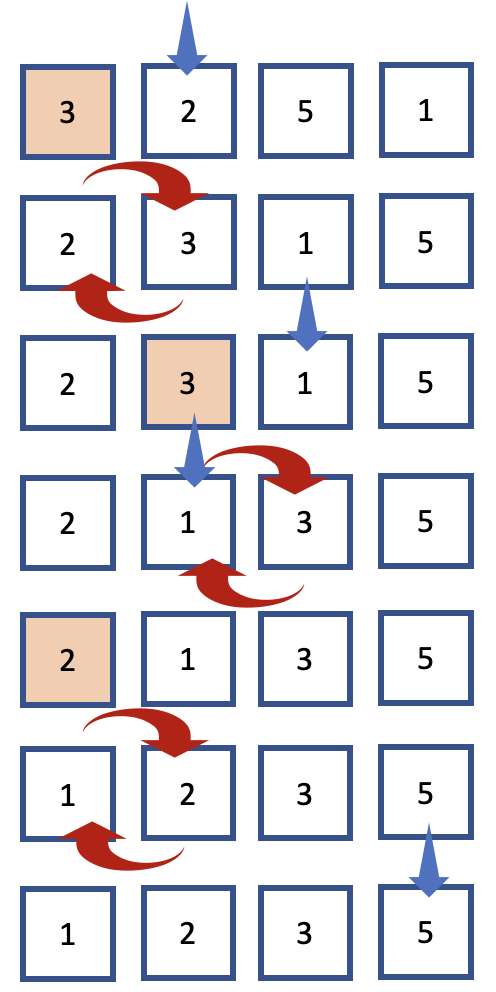선택된 원소에서 앞과 비교해서 오름차순의 경우 앞의 원소가 더 크면 선택된 원소와 자리를 교환한다.