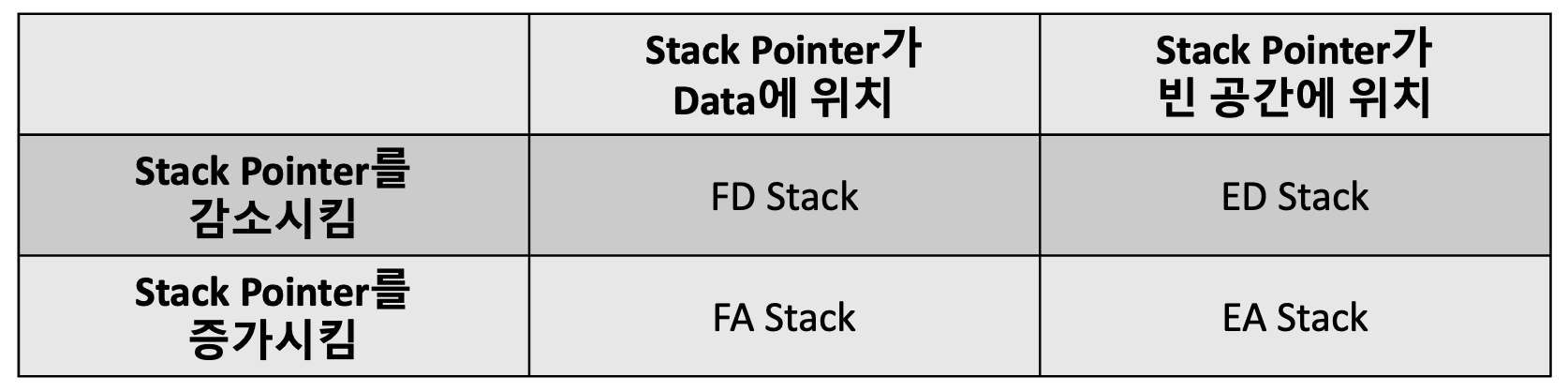1. SP(stack pointer)의 위치 - Data의 앞에 위치하느냐 (FULL), 빈 공간에 위치하느냐(Empty)