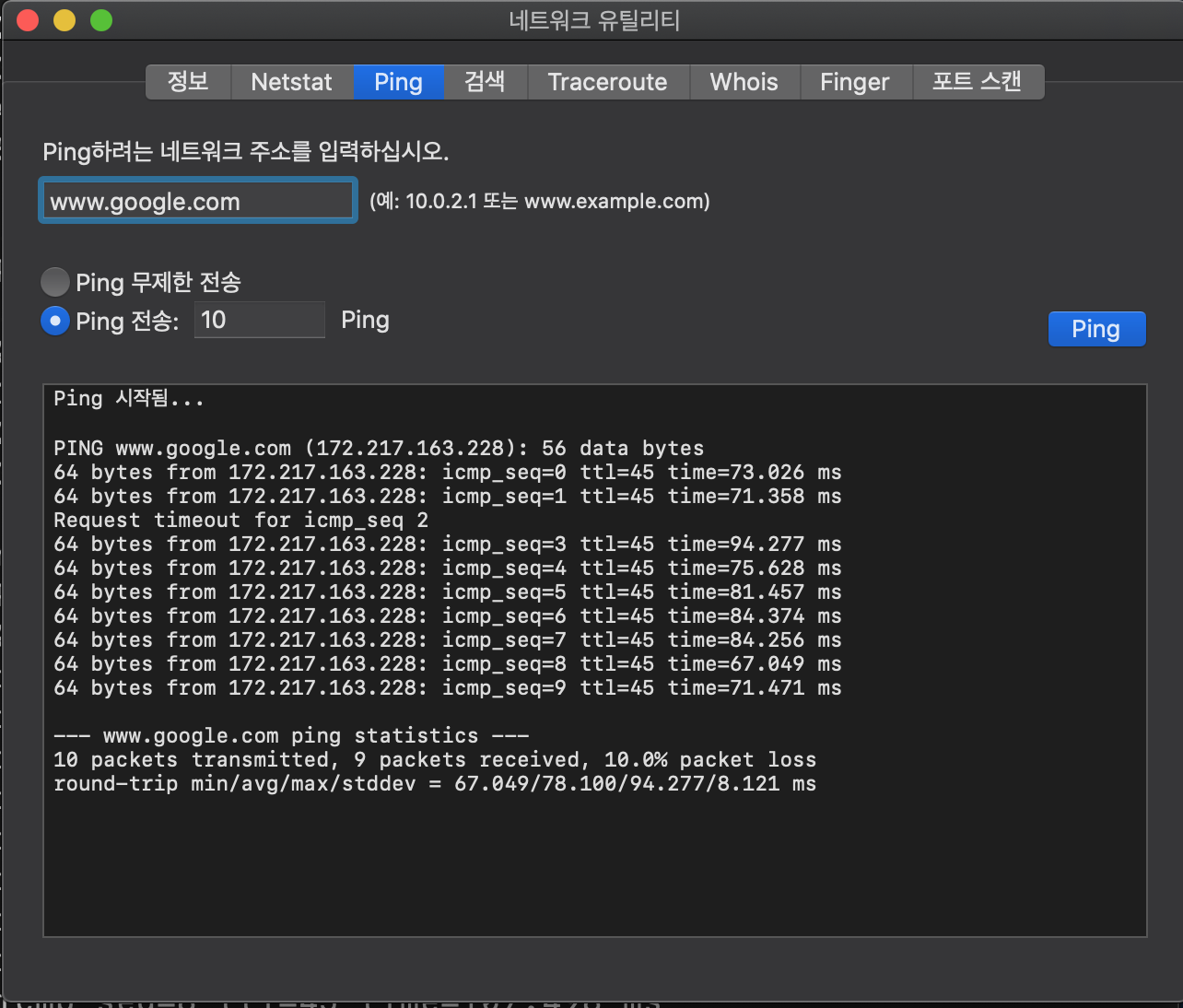 ping statistics 를 확인하려면 네트워크 유틸리티에 들어가서 확인하는 것이 편합니다.
