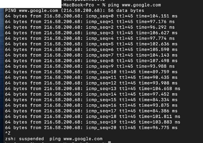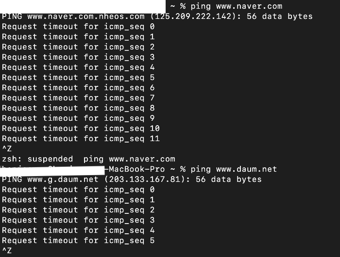 ping "도메인" 을 입력하면 되고, 그만 확인하고 싶을땐 Ctrl + Z 를 누르면 됩니다.