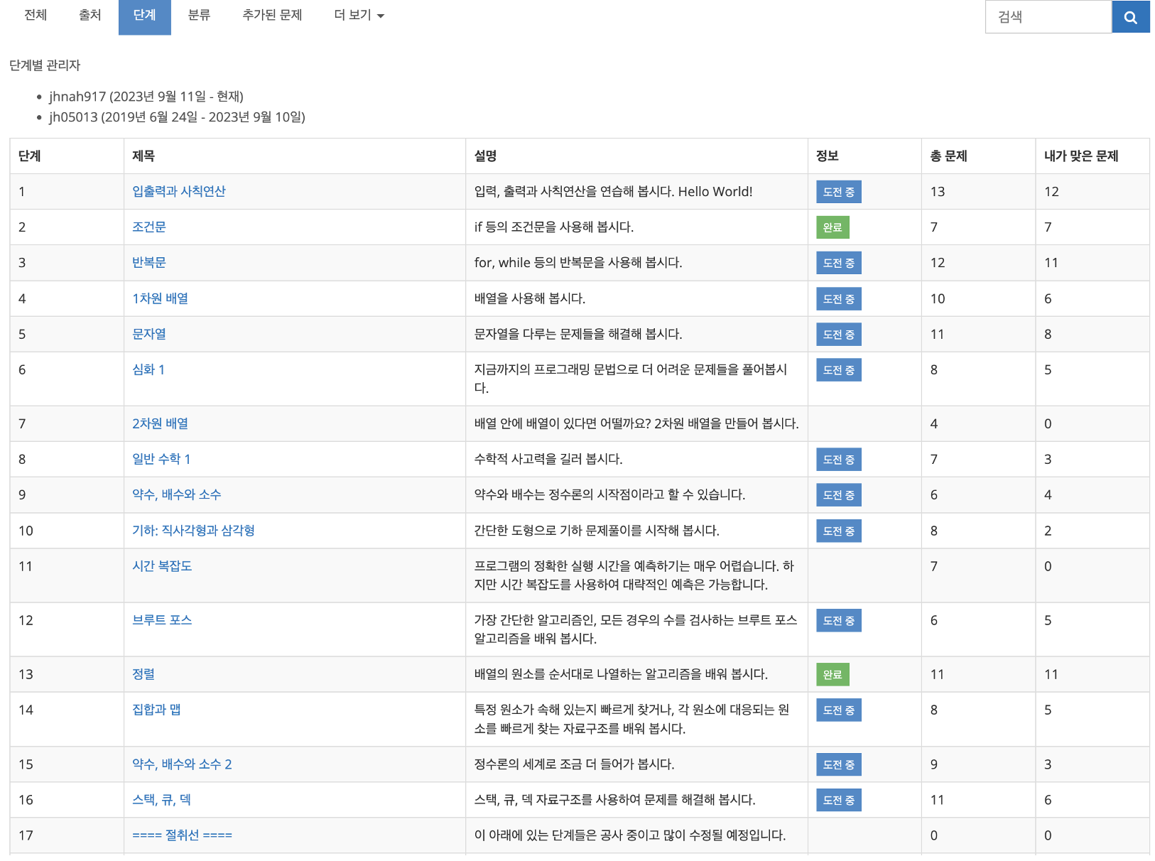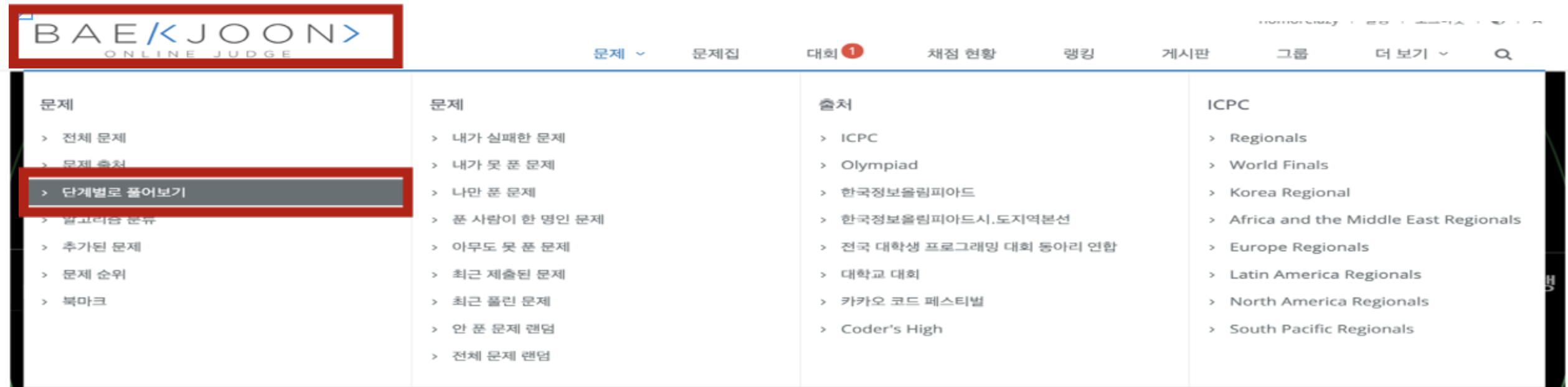 위 이미지처럼 단계별로 문제들이 나누어져있다. 우선 단계별로 모든 문제를 풀어보는 것을 추천한다.