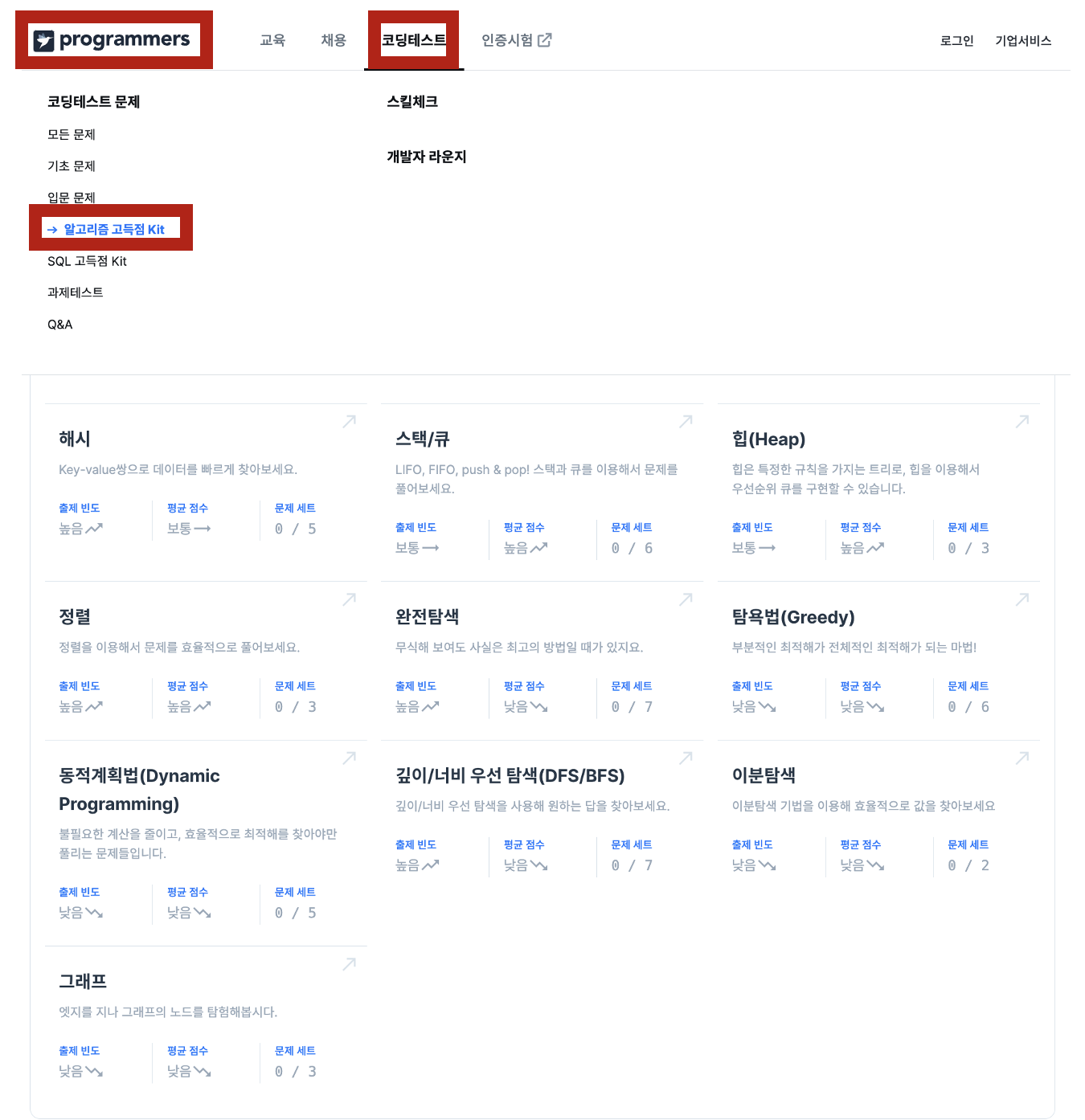 그런 경우 [프로그래머스 > 코딩테스트 > 알고리즘 고득점 kit]를 먼저 추천한다.