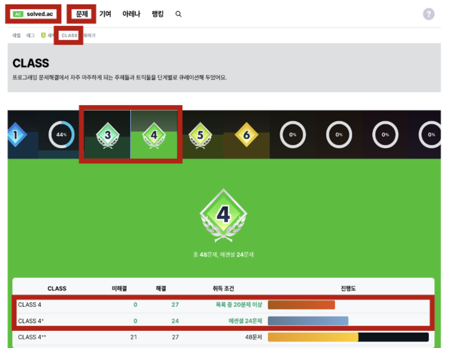 여기서 Class 3, Class4 문제들을 먼저 풀어보고, 풀 때는 기본과 + (에센셜) 목록에 있는 문제들을 모두 풀어보는 것을 추천한다.