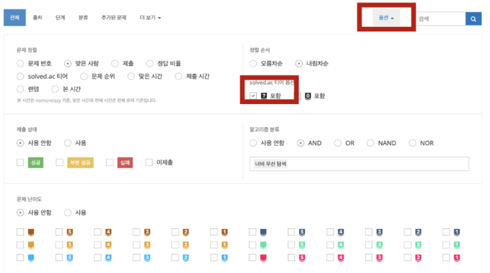 위 이미지처럼 문제 난이도가 보이지 않는 사람은 옵션에 들어가서 solved.ac 티어 옵션 포함을 누르면 된다.