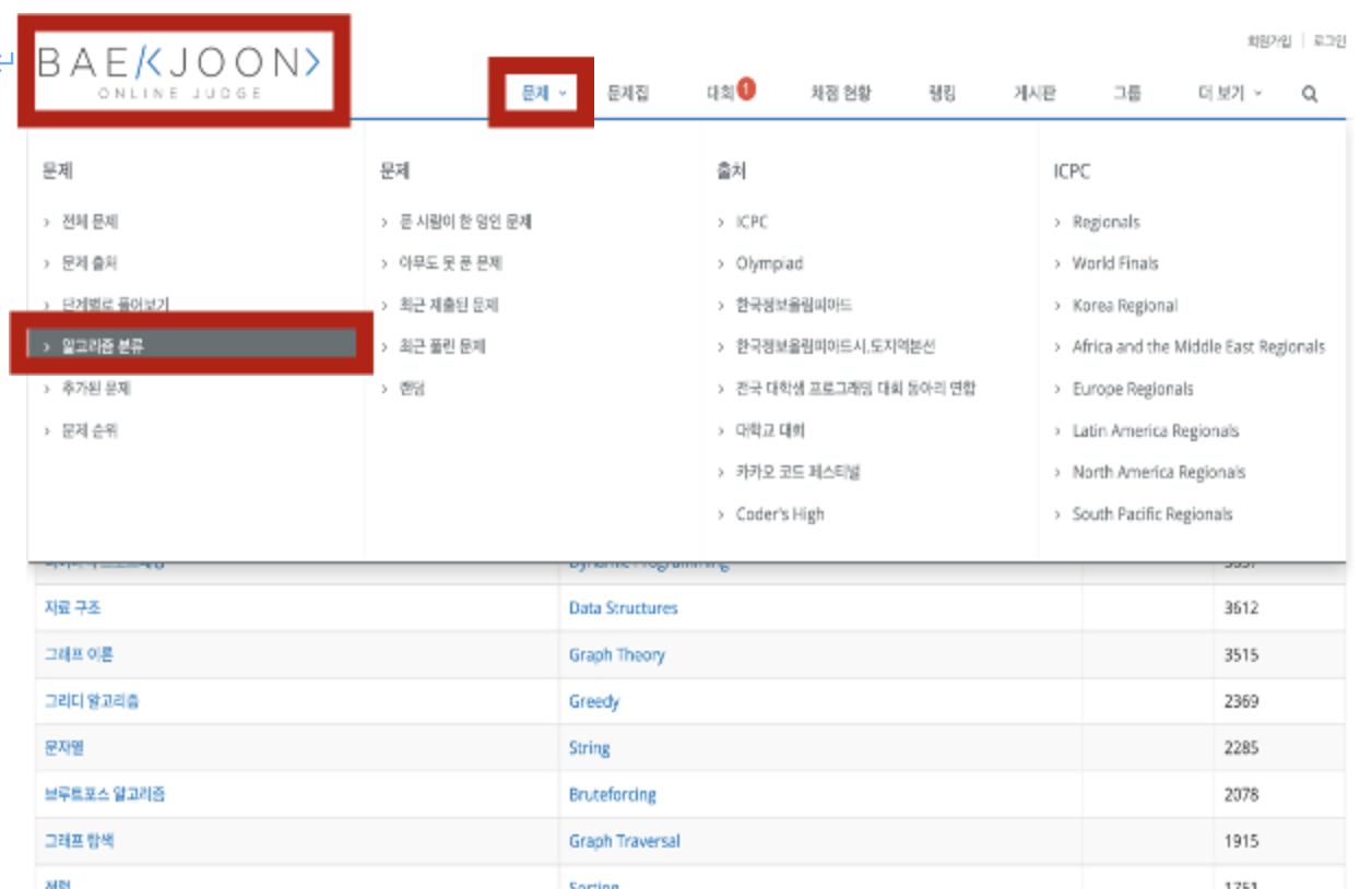 여기서 문제들을 풀어본다음에 [백준 > 문제 > 알고리즘별 분류]에 들어간다.