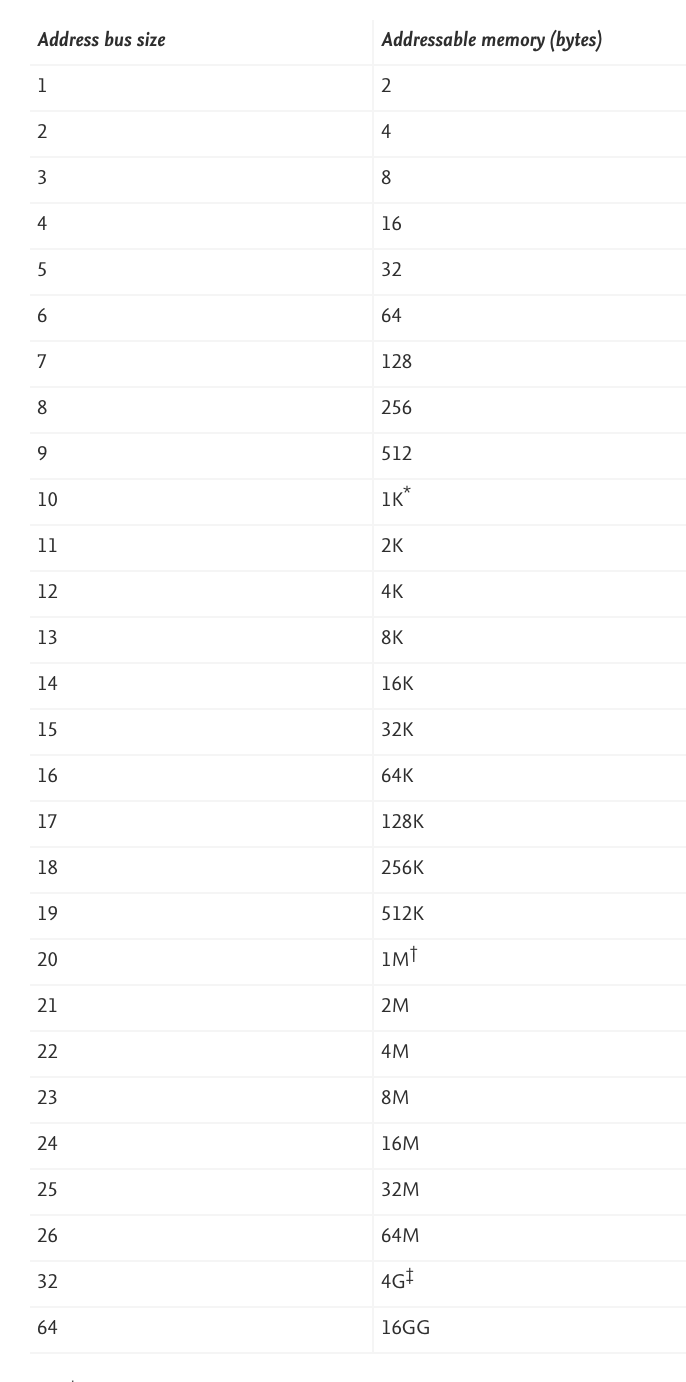 Address bus size당 접근가능한 addressable memory size이다. 한번에 저 size를 모두 받아 올 수 있다는 게 아니라