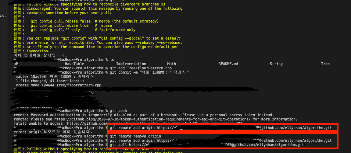 fatal: unable to access 'https://github.com/ellynhan/algorithm.git/': The requested URL returned error: 403