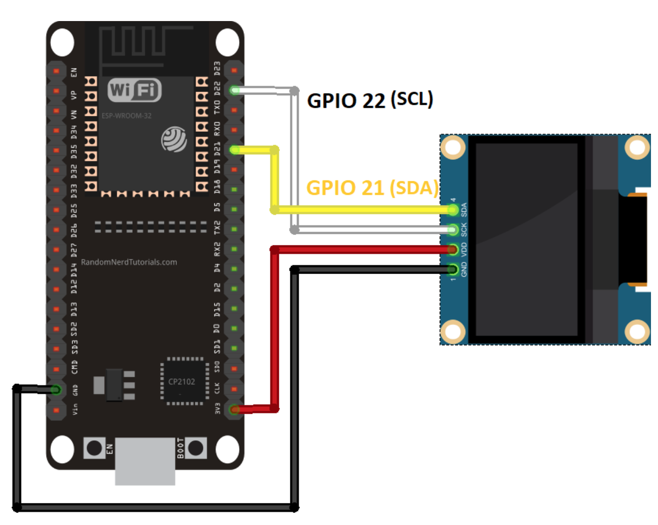 위와 같이 연결하면 된다. OLED가 I2C인경우 SDA가 GPIO21, SCL이 GPIO22에 연결되어야 한다.