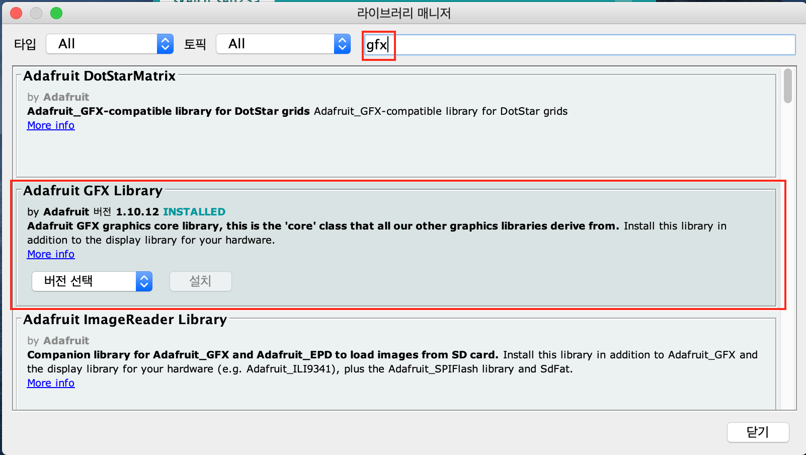 gfx를 검색하고 역시 adafruit의 Adafruit GFX Library를 설치한다.