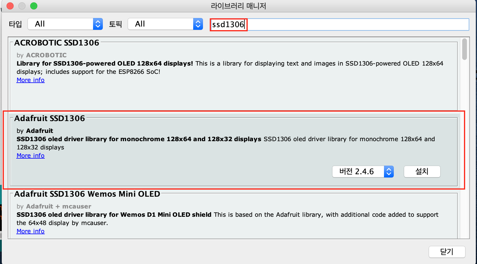 ssd1306을 검색하고 adafruit에서 만든 것을 선택한다. 대충 최신 버전을 설치해준다.