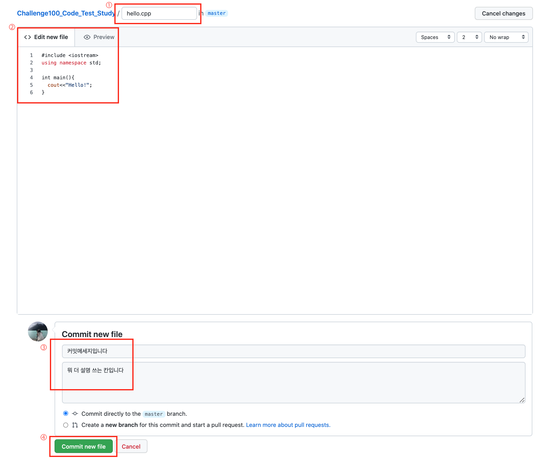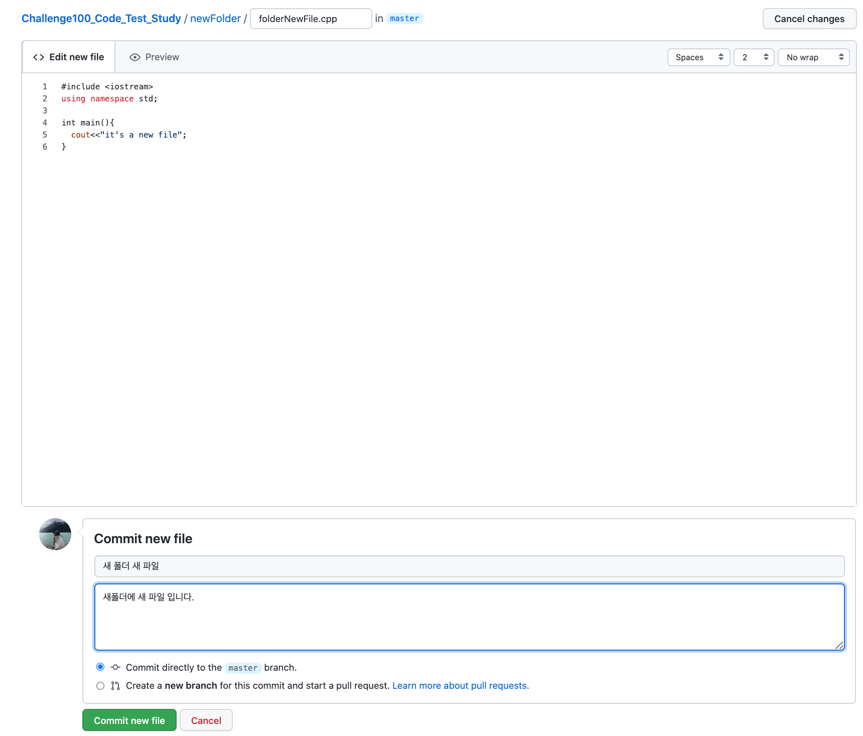 그다음 Commit new file칸에