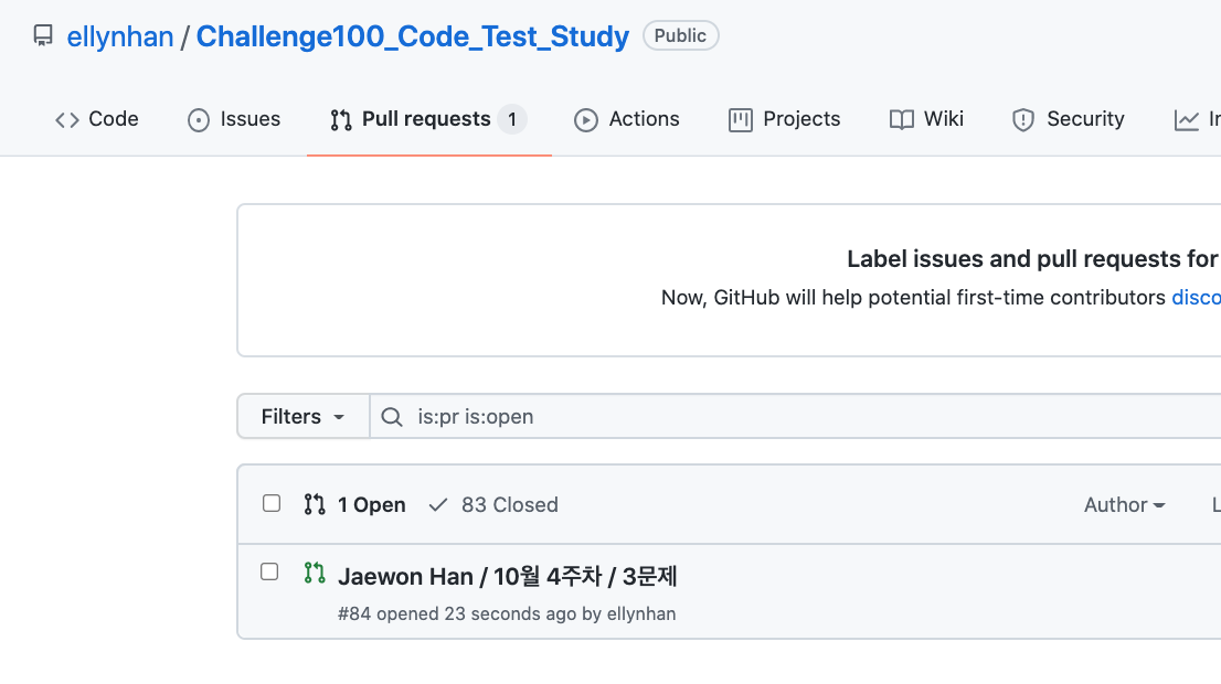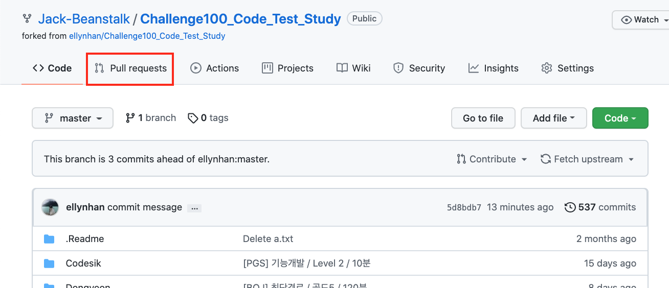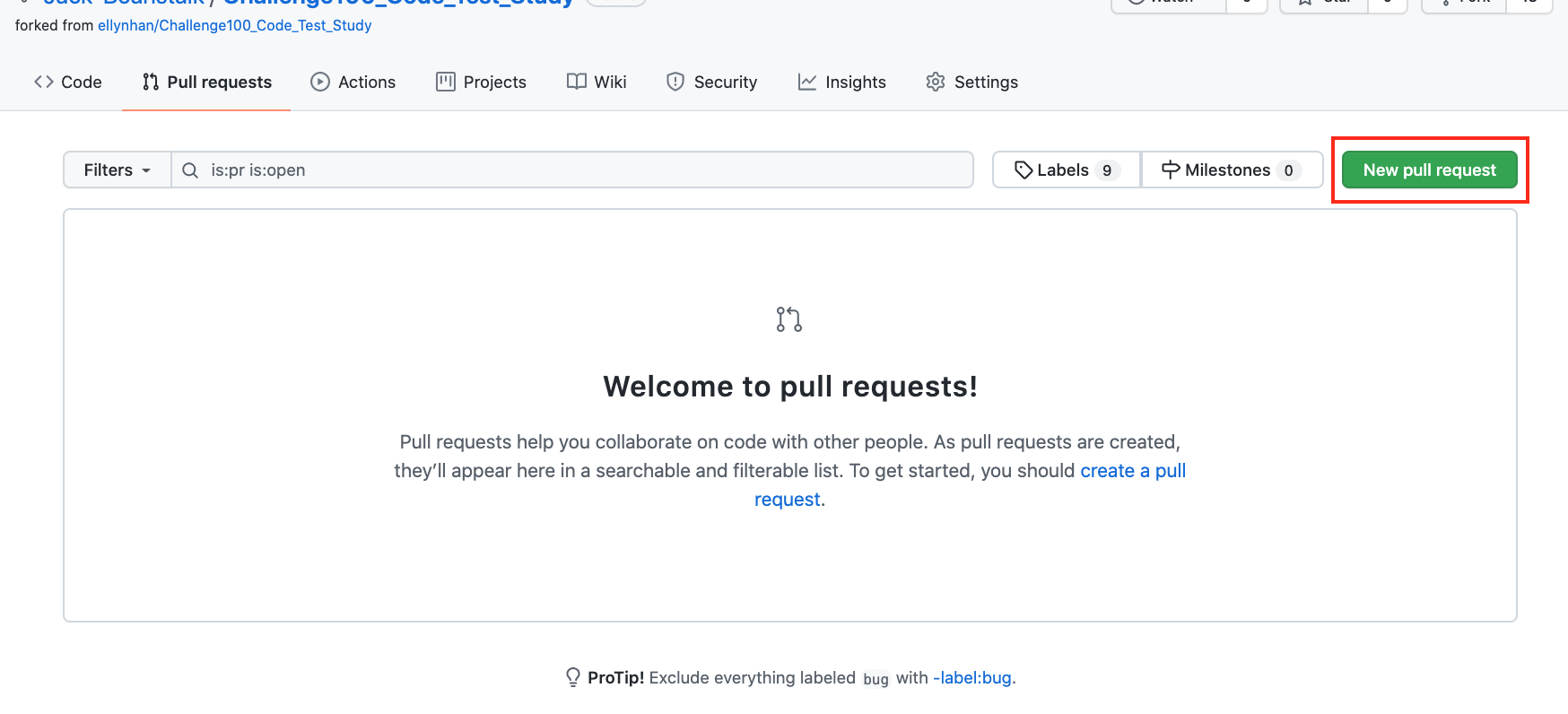 레파지토리에서 좌측 상단의 Pull requests 를 누릅니다.