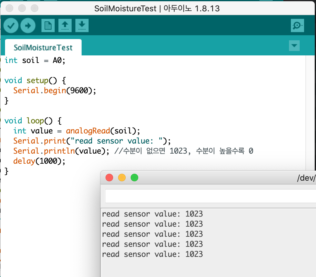 Serial.println(value); //수분이 없으면 1023, 수분이 높을수록 0