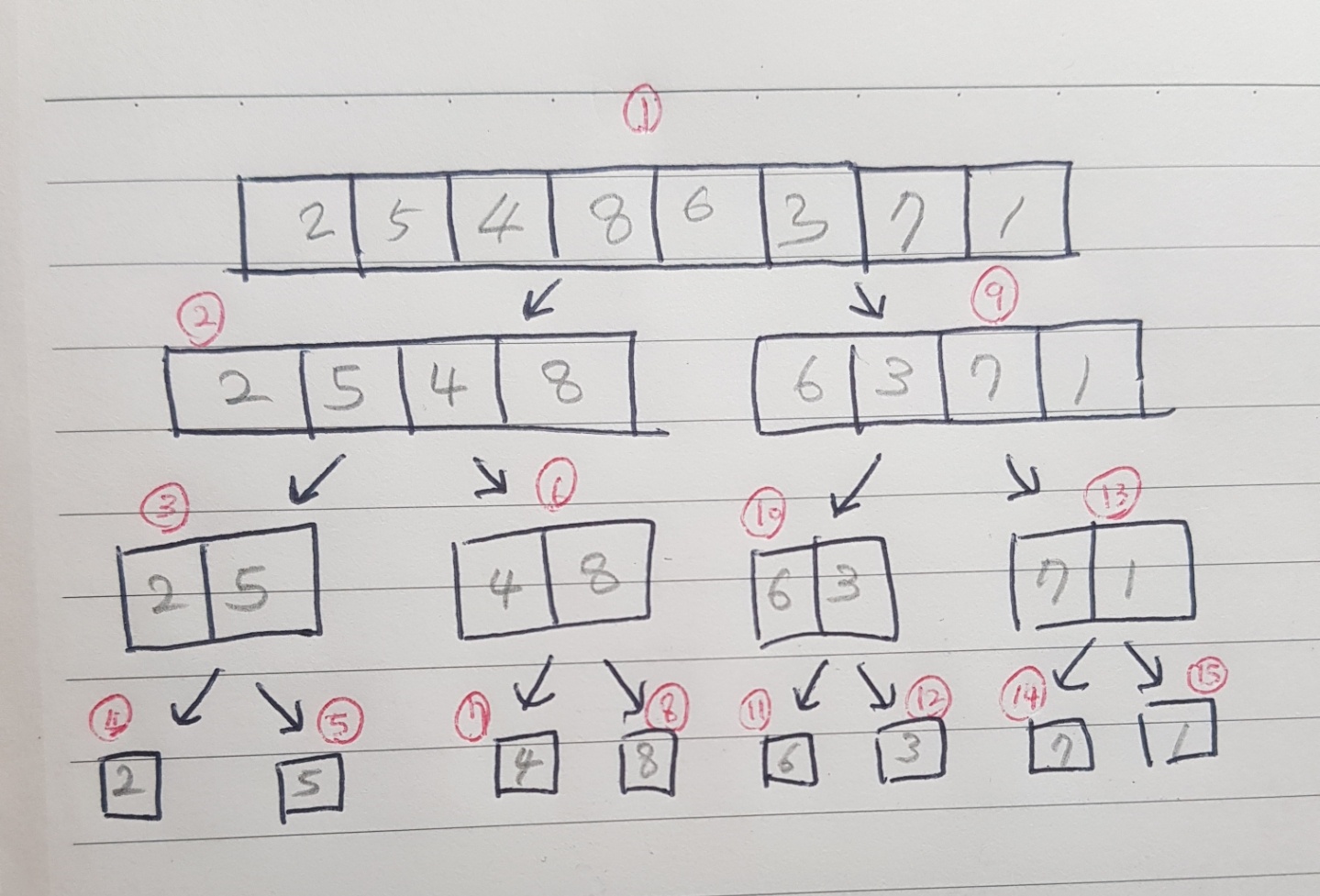 5번 분할이 끝난후 정렬&병합되는 과정은
