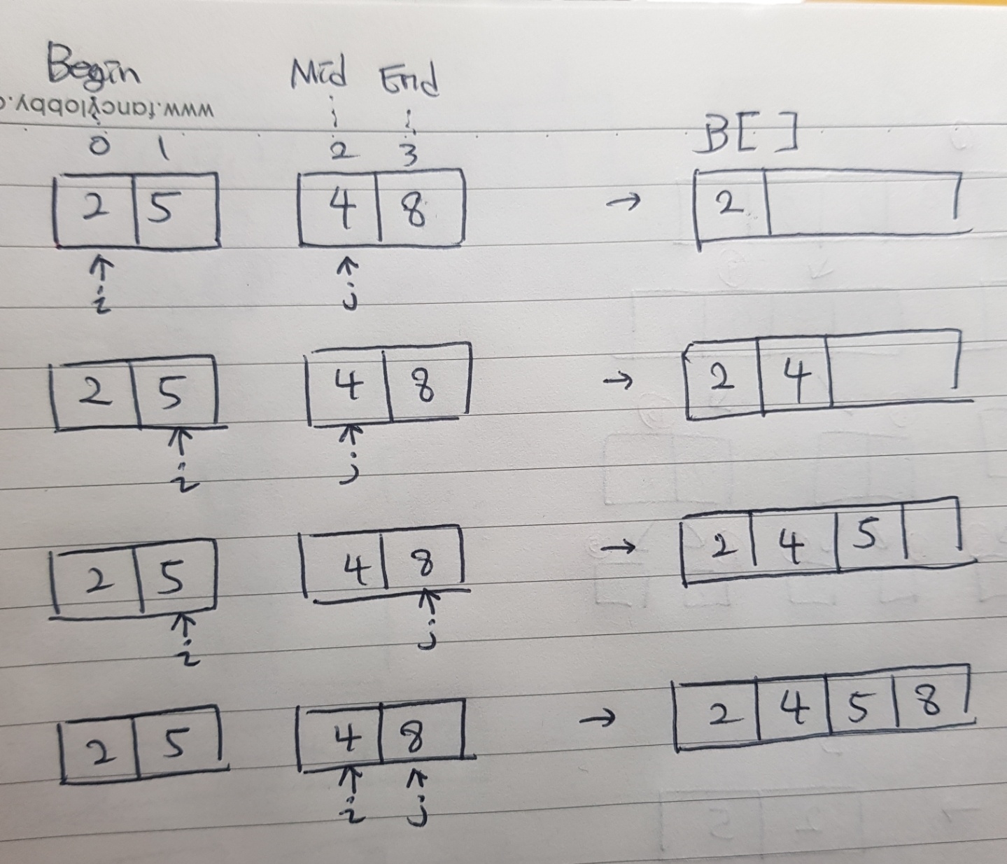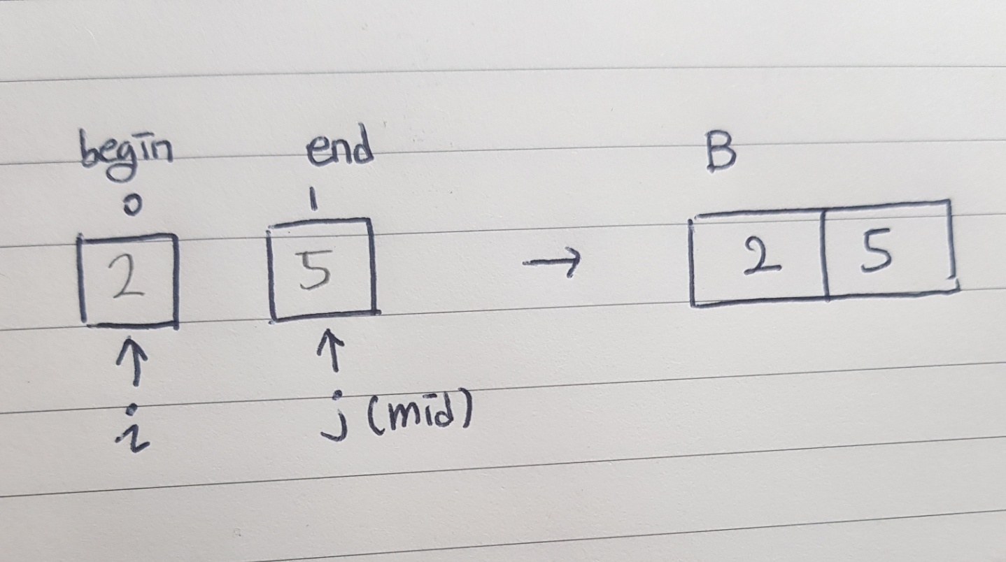 이렇습니다. i는 왼쪽 수열, j는 오른쪽 수열의 포인터를 담당한다고 생각하면됩니다.