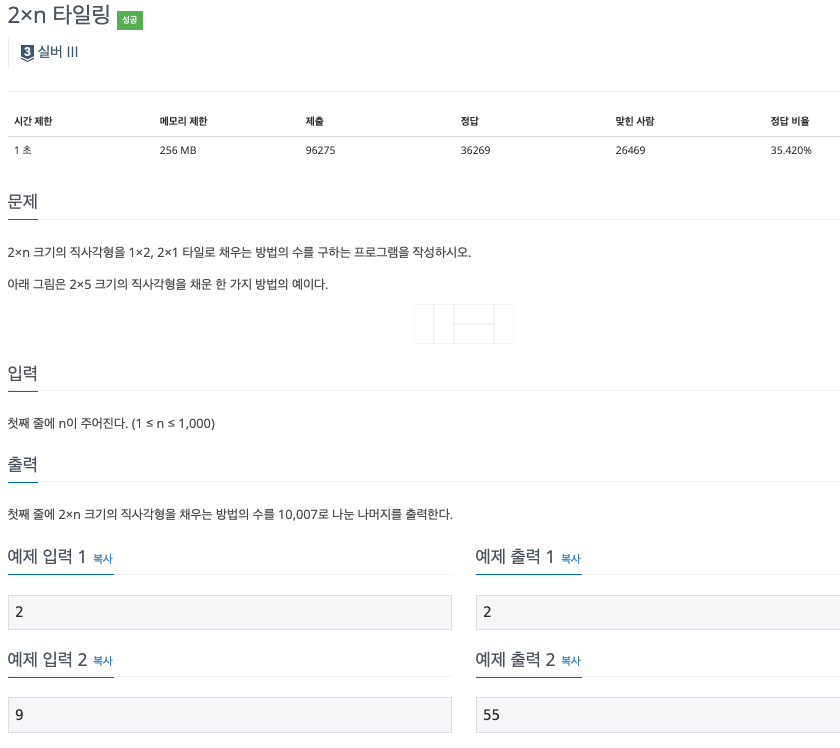 n=1인 경우에 1x2 두 개를 오른쪽에 붙이는 경우를 생각해 볼 수 있다.