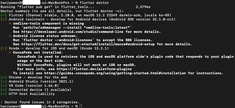 flutter doctor나 flutter -v를 터미널창에 입력.