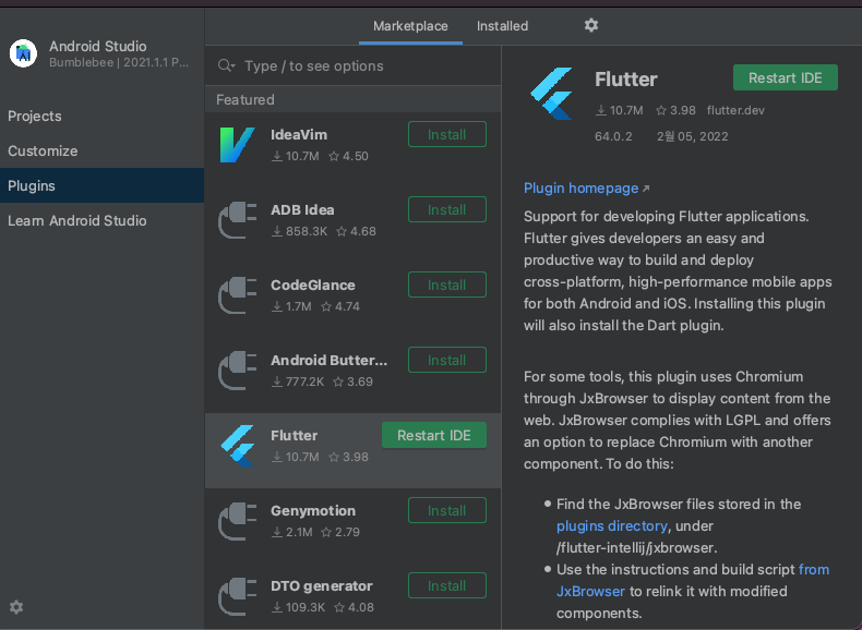 설치가 완료되면 새로 생긴 Restart IDE 버튼을 눌러 안드로이드 스튜디오 프로그램을 재시작 한다.